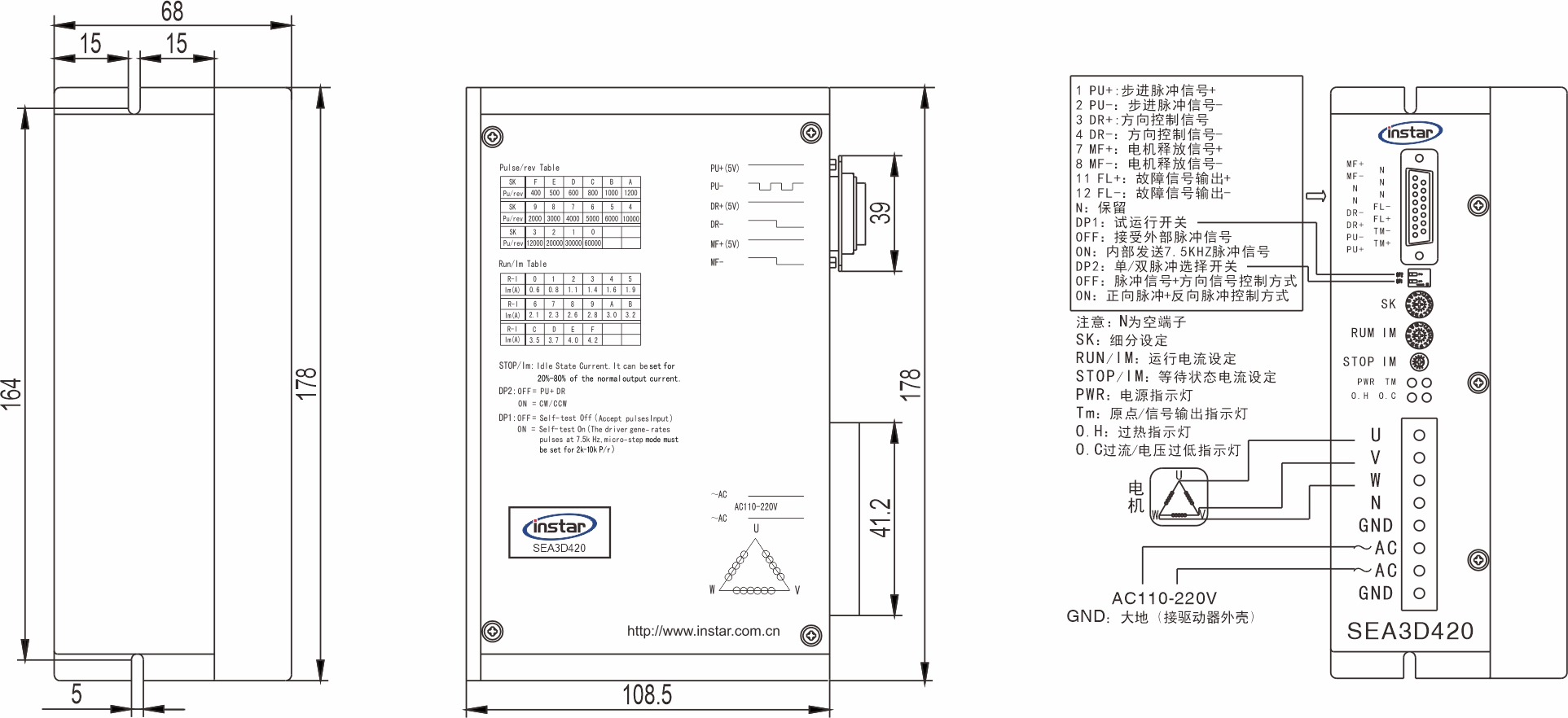 SEA3D420 为一款等角度恒力矩细分型步进电机驱动器,驱动电压AC110V~220V(最佳输入电压 AC220V),采用单电源供电,适配外径86mm~110mm、相电流在4.2A以下,3或6出线各种型号的三相混合式步进电机。